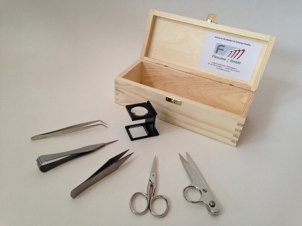 Das Flexuma Textilputzbesteck wird in einer robusten Holzschatulle geliefert, die außer dem Putzbesteck genügend Platz für diverse individuelle Utensilien, wie Textilscheren und –marker bereithält. Auch der aufgestellte Fadenzähler findet darin Platz.